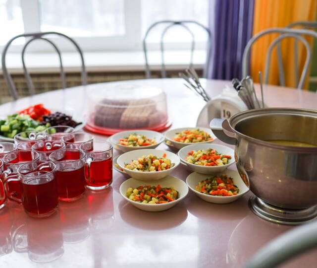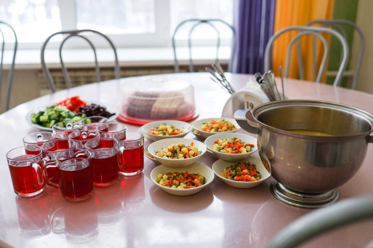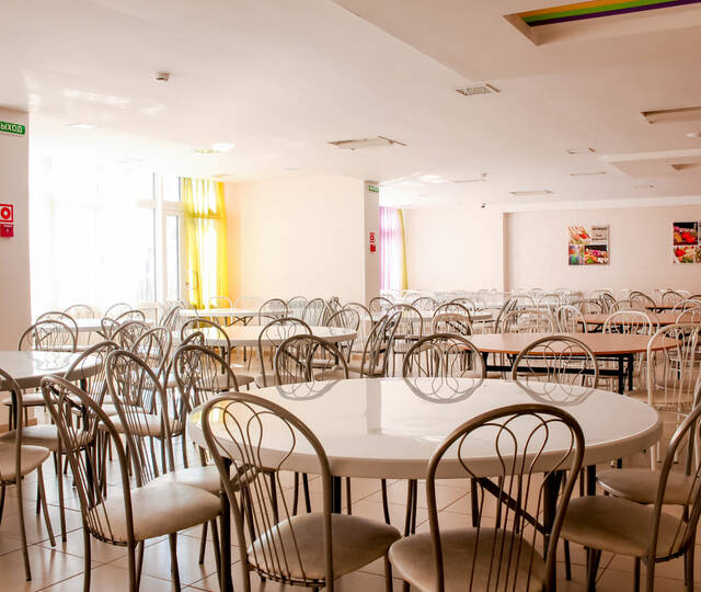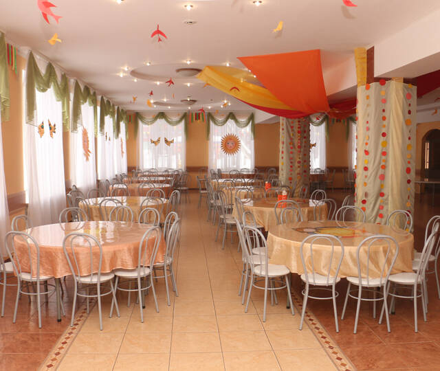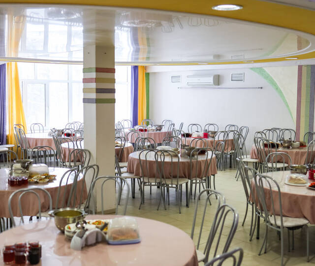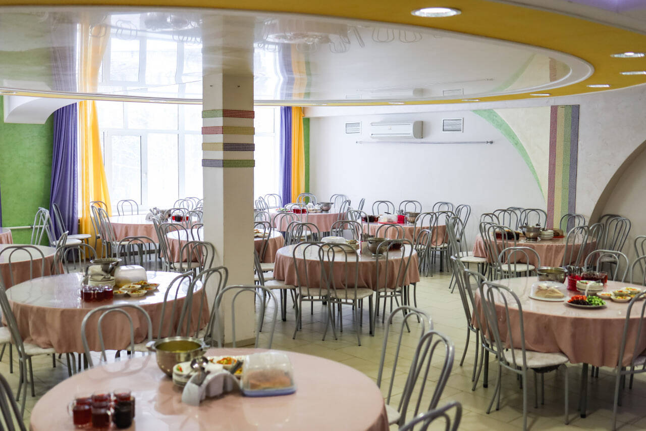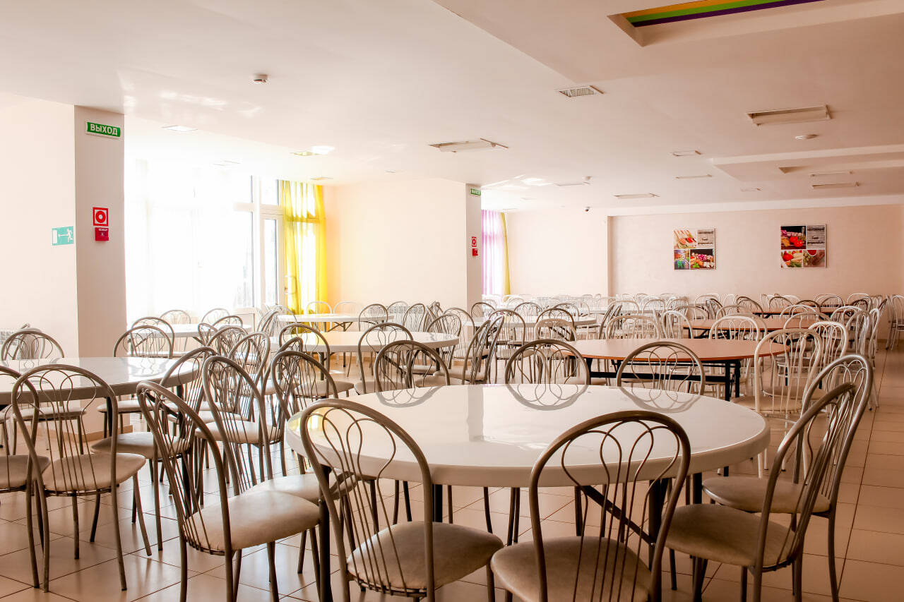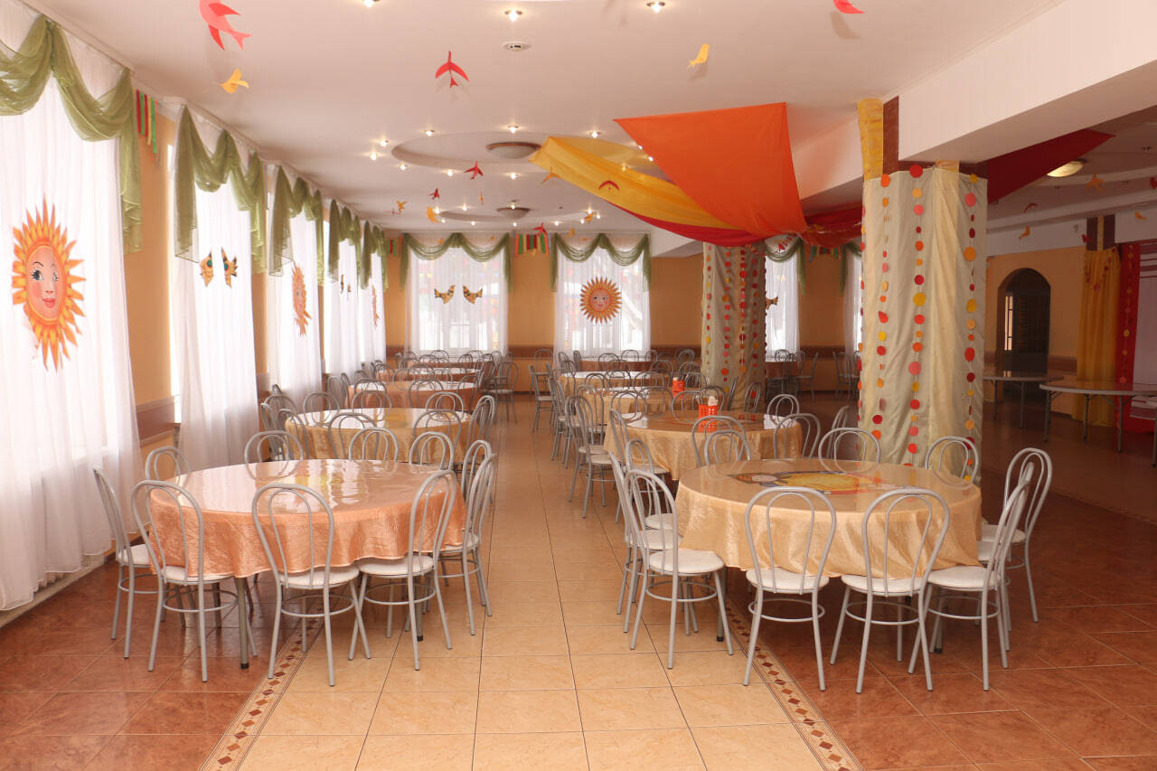 Питание осуществляется в отдельно стоящих зданиях двух столовых капитального типа строения. Для детей организуется 5-разовое питание (завтрак, обед, полдник, ужин, сонник) по сбалансированному 14-дневному меню в двух возрастных категориях, утвержденному Управлением Роспотребнадзора по Тюменской области, в соответствии с нормами санитарно-эпидемиологических требований к устройству, содержанию и организации режима работы загородных стационарных учреждений отдыха и оздоровления детей СанПиН 2.4.3648-20. Ежедневное включение в рацион питания овощей и фруктов. Каждая столовая имеет свою пекарню, которая выпекает сдобу для отдыхающих. В лагере организован питьевой режим с использование бутилированной воды. Также имеется своя система очистки.