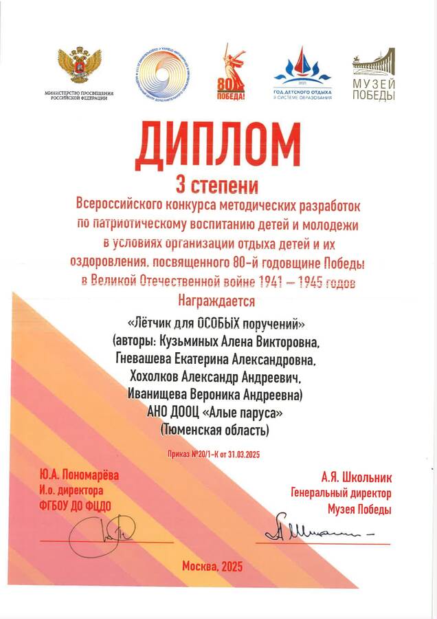 Подведены итоги Всероссийского конкурса методических разработок по патриотическому воспитанию детей и молодёжи в условиях организации отдыха детей и их оздоровления, посвящённому 80-й годовщине Победы в Великой Отечественной войне 1941 – 1945 годов.