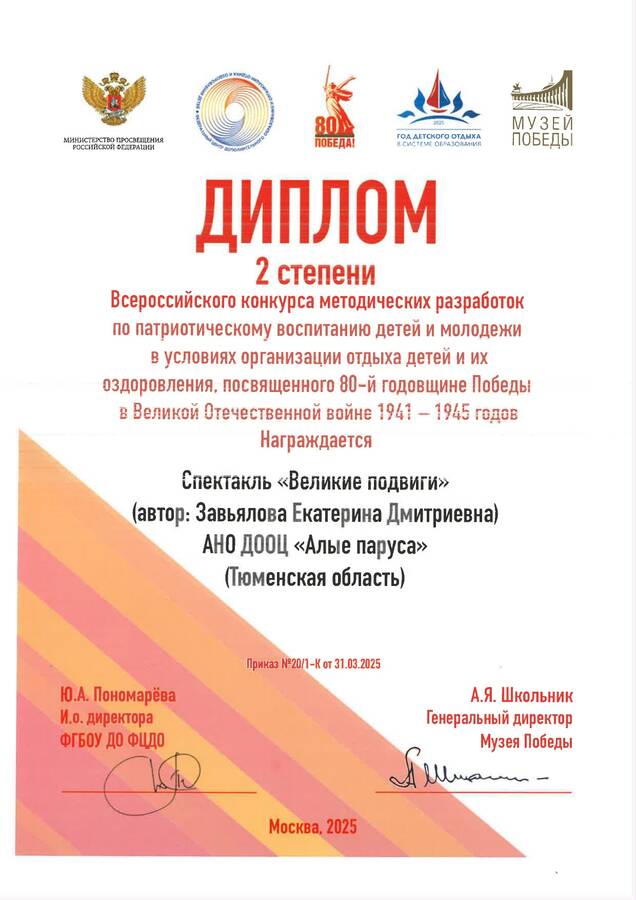 Диплом 2 степени - Спектакль «Великие Подвиги», автор Завьялова Екатерина Дмитриевна, АНО ДООЦ «Алые паруса»