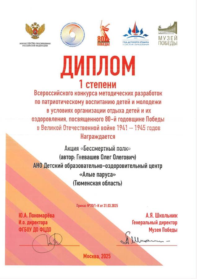 Диплом 1 степени - Акция «Бессмертный полк» , автор Гневашев Олег Олегович, АНО ДООЦ «Алые паруса»